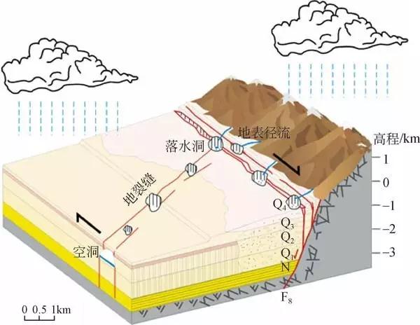 ▋ 3. 勘探发现地裂缝具有特殊的立体结构特征,揭示了其生长规律。通过科学探槽、钻探和地球物理勘探,发现汾渭盆地长大地裂缝均与下伏断层相对应,并随深度位错量增大而具同生断层特征,表明汾渭盆地主干地裂缝多为隐伏构造破裂在地表的露头;发现地裂缝沿走向时隐时现,具分段特征,平面上一主多支,具分叉特征,垂向上10m以浅表现为多条拉裂缝,向深部收敛成单条剪切面,具分异特征,剖面上分为破裂带和影响带,具分带特征;地裂缝表现出垂向上自下而上逐步生长、向两侧分带增生、沿走向分段扩展的生长规律。这些成果为地裂缝成因机理的研究和工程减灾设计奠定了重要基础。