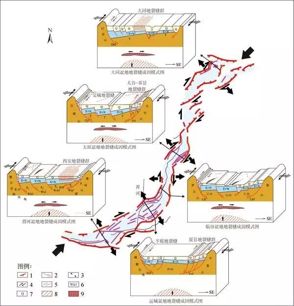 ▋ 6. 发现地裂缝与断层的共生由断层局部构造动力所驱动:科学探槽和钻探揭示,汾渭盆地地裂缝与断层普遍相伴共生,且主要由断层局部构造动力所致:盆缘断裂差异垂向蠕动的共生裂缝和伴生在断层上盘的次级裂缝;盆内块间断裂垂向活动伴生的共生裂缝和派生在断层上盘的次级裂缝;隐伏走滑断层水平扭动派生的地裂缝;土层构造节理在区域构造应力场作用下开裂响应成缝。从理论上诠释了地裂缝形成与断层局部构造动力的内在关系。