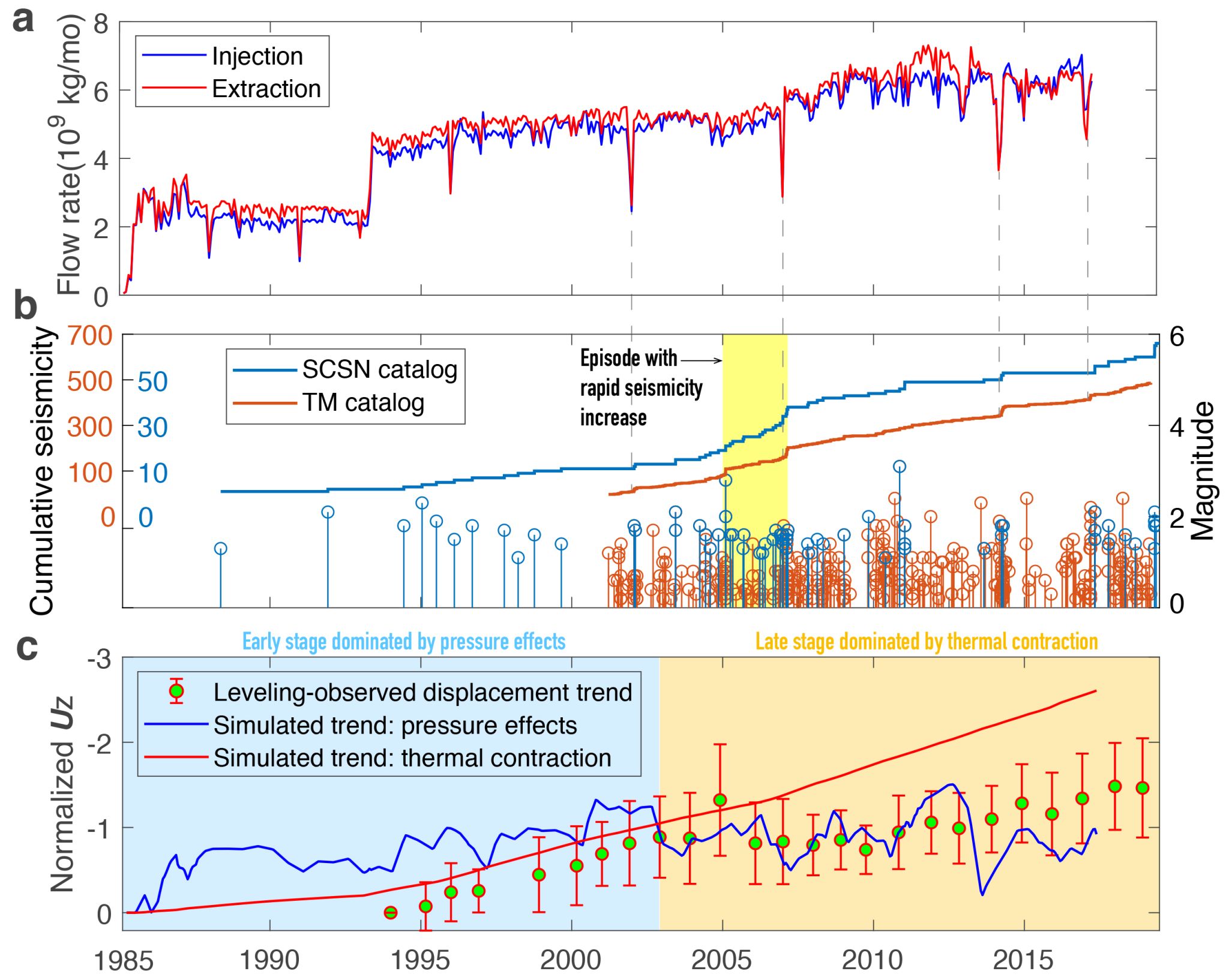 此外,他们还发现:(1)Heber地热场西部和东部地区在注水阶段发生的地表沉降异常分别与中心区域的“虹吸”效应以及不断增强的热收缩效应有关;(2)在Heber地热场开采历史中,孔隙压力波动和孔弹效应对地热场变形的影响保持相对稳定,热收缩效应的影响随着时间不断增加,经过30多年的开采,热收缩效应比前两者的效应大2-3倍;(3)Heber地热场地表形变和地震活动增长的长期趋势由热效应控制,孔隙压力效应只驱动瞬时变化(下图)。