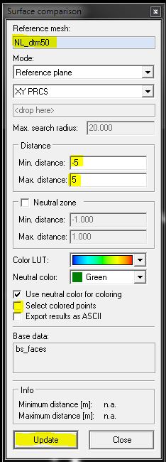 3、地表植被过滤(Separation):在视图中显示原始点云数据,并点击显示属性的“surface comparison“即表面模型比较工具,并将之前过滤的粗略模型拖拽到视图,并设置其为比较的基础对象,同时在比较工具中选择点相对粗略模型距离的最大和最小值,点击计算,软件就会自动通过不同的颜色来表示所有点相对粗略模型的距离,同时勾选选择带颜色的点云,反选并删除距离粗略模型较远的点就可以得到去除植被及地上物的点云数据,同时该数据会自动保存在该子文件目录下。