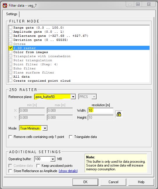 一旦数据顺利的导入后,我们就可以进行数据的数字高程模型创建。对于数字高程模型而言,对进行点云的地表点和非地表点分离删除是很必要的,所以我们创建一个光栅矩阵模型并覆盖整个选区,并根据栅格网设置密度的节点寻找到该节点Z值最低的点数据,通过这点再建立一个粗略的地形模型,用于分离地表及非地表点,以下有个关于这个RISCAN PRO功能的简单指导。