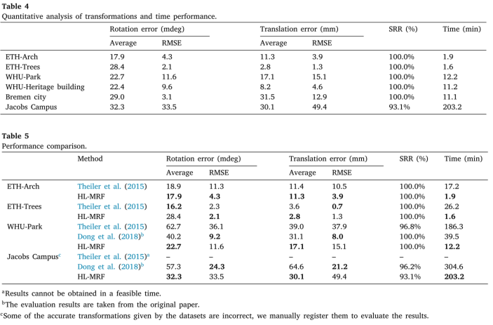论文提出的配准框架能够快速且鲁棒地对多站地面扫描点云进行配准参数估计。通过在大量公开数据集上测试的结果表明,该框架能够比目前最先进的方法在效率上取得至少30%以上的提升,精度能够达到或超过目前最先进方法的水平。