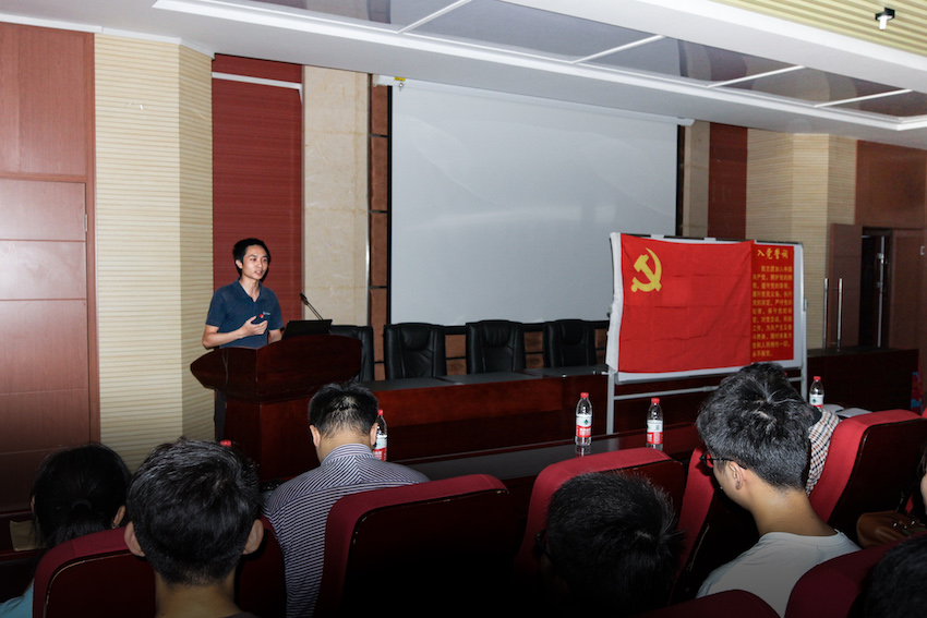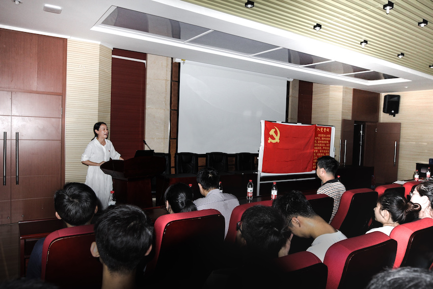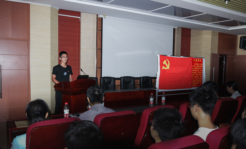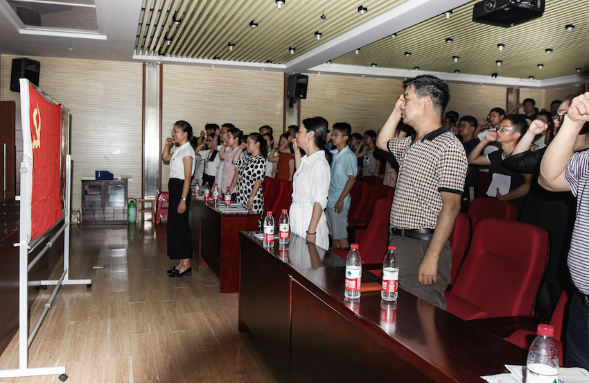 宣誓环节,在辅导员戴昀老师的领誓下,全体党员面向鲜红的党旗,重温入党誓词,再次庄严许下誓言。