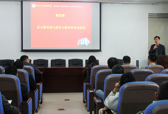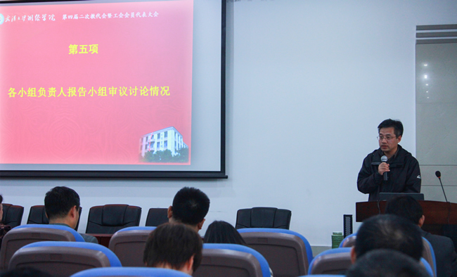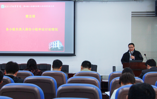 院工会财务审查小组副组长詹总谦就《2015年-2016年学院财务检查报告》作了说明。院工会副主席王正涛就《本科教学工作量计算办法(修订稿)》作了介绍。随后进行了分组讨论,邓非、李英冰和王甫红先后代表三个小组向大会汇报了分组讨论情况。会议通过了《关于进一步严格学院管理工作的实施意见》、《2015年-2016年财务检查报告》和《本科教学工作量计算办法(修订稿)》。