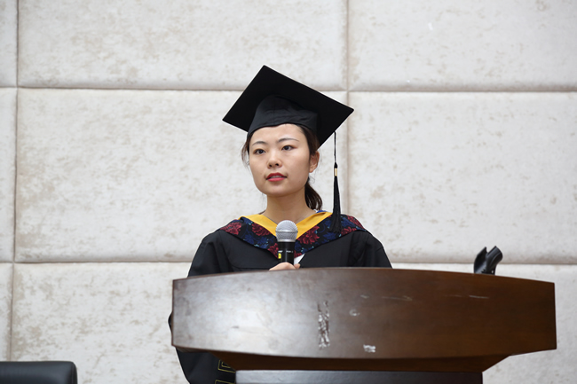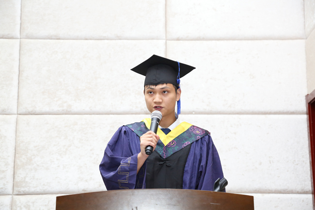 毕业研究生代表邱国庆、本科毕业生代表杨柳分别发言,回忆在校学习生活的感受和成长体会,感恩母校培养,感念师恩和同学情谊,并憧憬美好未来。在校生代表罗泽熙同学发言,感谢毕业生学长们在其学习、工作、生活等方面引领和示范作用,并祝福学长们前程似锦,一帆风顺。青年教师代表史俊波老师发言。他回忆了自己在学院从本科一直到博士求学经历以及留校任教的工作体会,并分享自己与校友们交流与合作的点滴故事,寄语毕业生们传承弘扬“敬业 乐群 求是 创新”的院训精神。