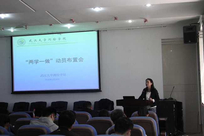 随后,她重点就学院“两学一做”学习教育方案进行了说明,对工作进行动员和具体布置。学什么?做什么?如何学?如何做?她结合学院实际,从内容、形式、机制和保障等方面提出了明确要求。她强调,党支部作为党的基层组织,是党的执政之基、力量之源。她要求各支部书记要按照学院“两学一做”学习教育实施方案,制定并落实学习计划,担当起“两学一做”学习教育的主体责任人,真正把学习教育落实到支部,把全面从严治党要求落实到支部每个党员。她指出,开展“两学一做”学习教育,学是基础,关键在做,要内化于心,外化于行,做到“知行合一”。她要求学院党员干部、教师党员以及学生党员要根据自己身份,明确自身责任,完成好“两学一做”学习任务。