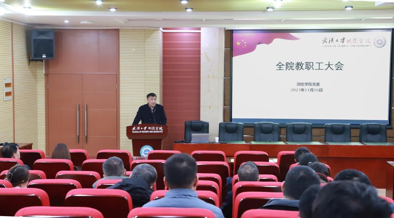 第二阶段为全院教职工大会,姚宜斌院长通报了学院近期工作情况,并就学院下一步重点工作进行了部署。他肯定了学院取得的可喜成绩,尤其是在重点研发计划项目申报、全国高校教师教学创新大赛中取得的新突破;目前,学院还在积极申报全国和省级重点实验室。下一阶段,希望全院继续凝心聚力,寻突破、谋发展,努力在高质量发展指标中取得更好的成绩,重点做好招生和就业工作。会上,姚院长就学期末的教育教学和主动关爱学生等工作做了强调。