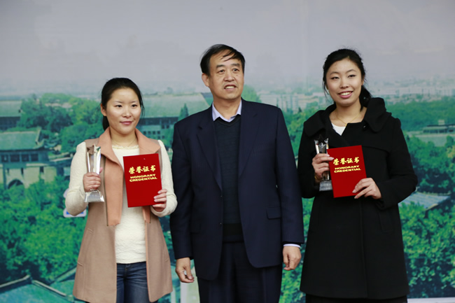 校党委副书记、副校长王传中为张婧(左一)、赵一君颁奖并合影留念