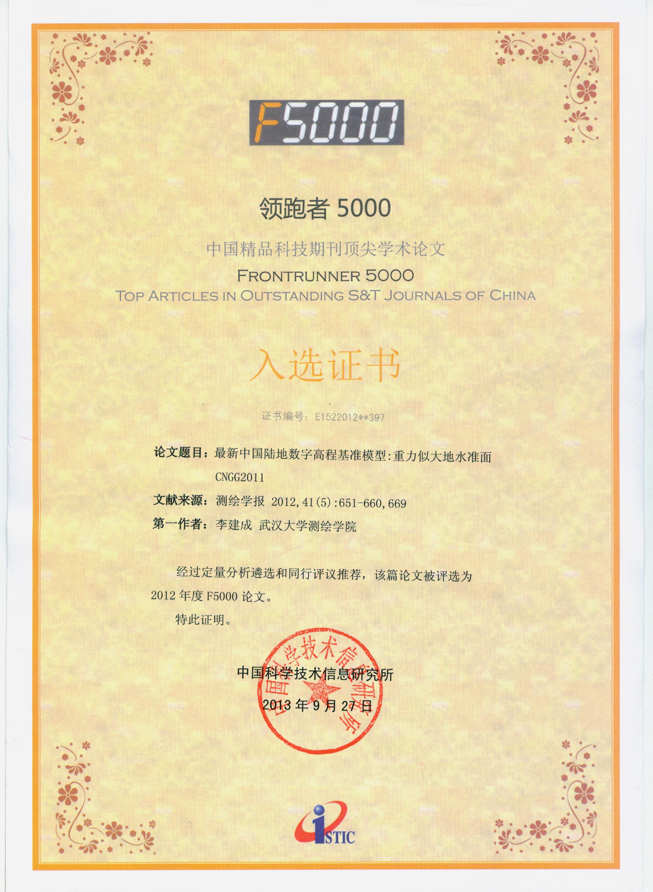 近日,草榴社区 李建成院士的一篇题为“最新中国陆地数字高程基准模型:重力似大地水准面CNGG2011”的论文入选中国精品科技期刊顶尖学术论文平台,即F5000(领跑者5000)。