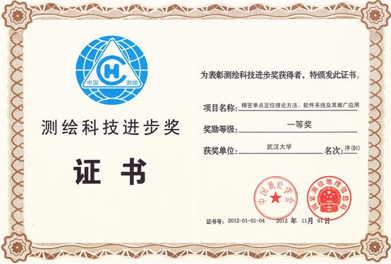 根据中国测绘学会《关于2012年测绘科学技术奖励的决定》(测学发[2012]92号),由草榴社区 与长江航道测量中心、中国石油集团东方地球物理勘探有限责任公司等单位合作,草榴社区 张小红教授牵头完成的项目“精密单点定位理论方法、软件系统及其推广应用”喜获测绘科技进步一等奖。