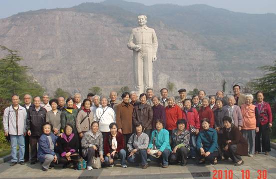 在这高陡坡前,站立着毛主席高大的塑像。大冶铁矿是毛主席生平唯一视察过得铁矿,经导游介绍,58年的金秋,毛主席视察草榴社区 后,第二天直奔大冶铁矿。而我们一行的同志中,不少人正是当年受毛主席接见的师生,听着倍感亲切。接着大家兴高采烈地在塑像前拍照留念。