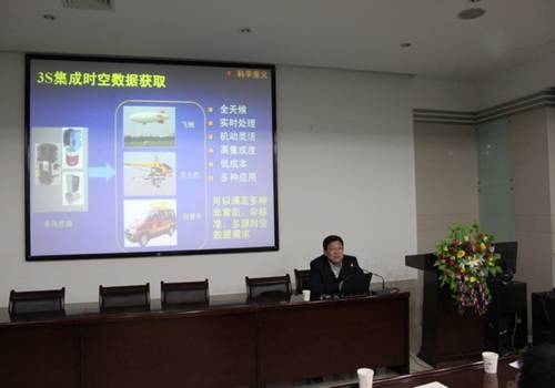 接下来,李校长介绍了他的主要工作经历和“时空数据智能获取技术与应用教育部工程研究中心”的主要情况。他谈到目前该实验中心主要以国家973、863、国家自然科学基金为主的纵向研究项目,其研究和项目正是为了满足国家和社会的迫切需求。紧接着李校长就多传感器时空数据获取、多源数据的融合与挖掘、时空数据服务展开详细讲解。在数据获取方面,已从传统的车载获取方法,逐步发展为无人机获取系统,要突破现有方法在时效性、灵活性、多样性局限,以满足多种非常态、非标准、多源时空数据需求。李校长谈到过去测绘总是在获取少量信息的基础上来分析问题,现在我们面临的挑战是从海量多源时空数据中获取最有用信息技术的分析方法,面向不同实时应用的时空数据处理、传输与表达方法,实现高效信息服务。
