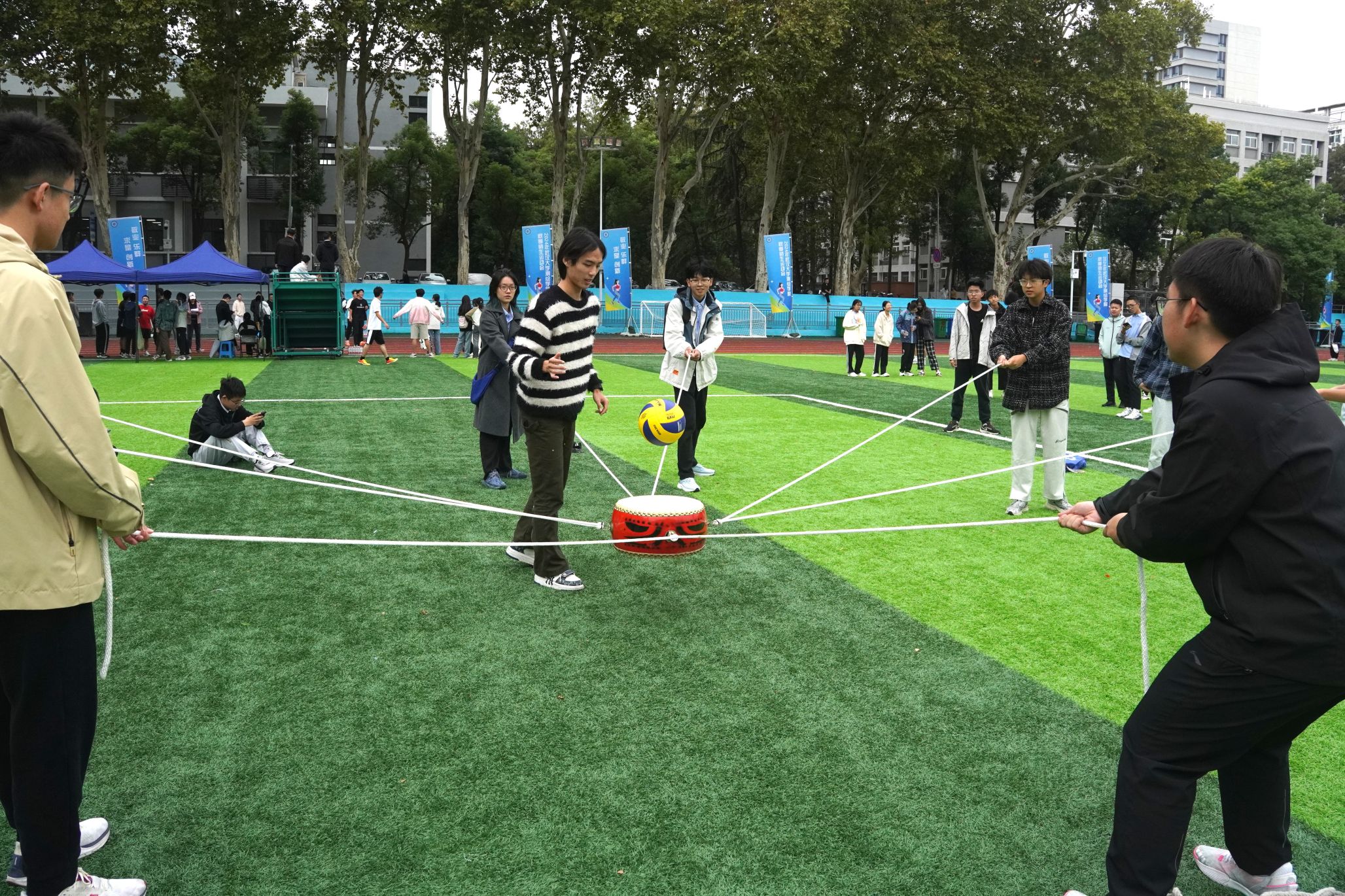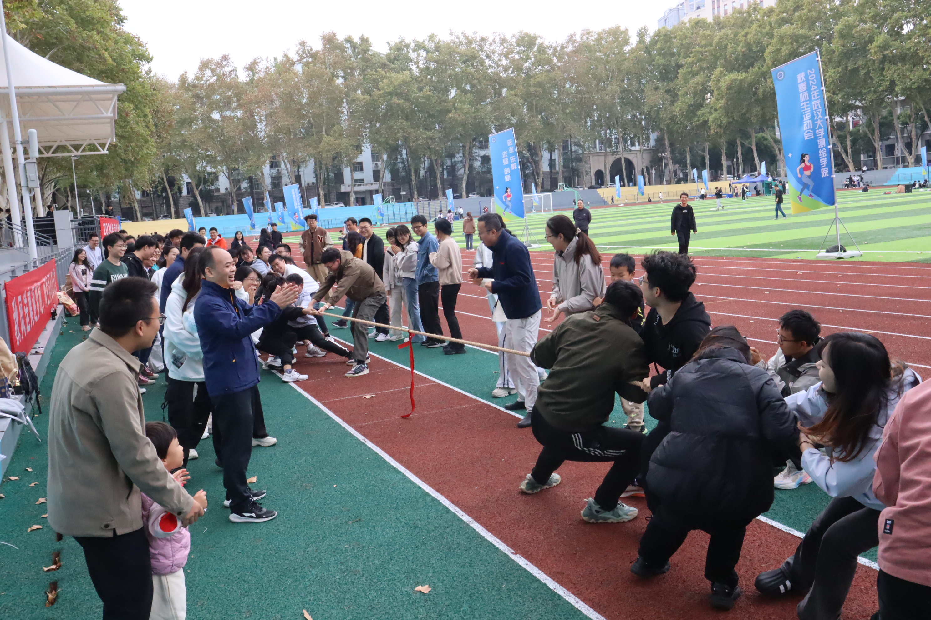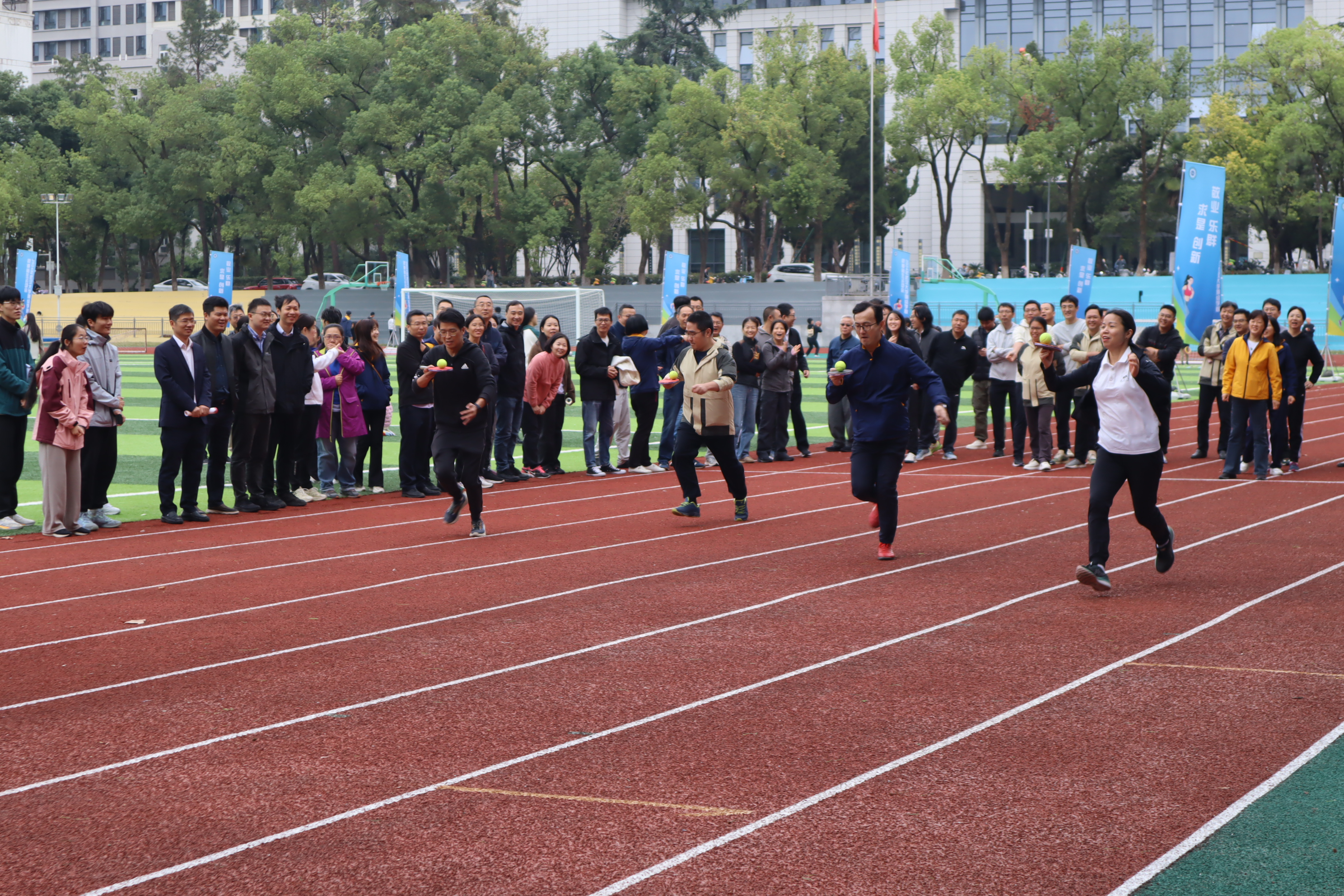 开幕式结束后, 2024级本科生举行了广播体操比赛。接下来,师生运动会的各项比赛依次上演,网球、篮球、足球齐上阵,大家展现十八般武艺,花样接力笑点频出;往左、往右,颠鼓击球用团结的力量敲出清脆的回响;往上拋、往下拋,趣味套圈扣人心弦……大家团结一致,争夺桂冠。老师们健步如飞,展现不同以往的一面;同学们踊跃配合,探索竞赛新局面。笑声、加油声充斥整个操场,驱散了清晨的寒意。