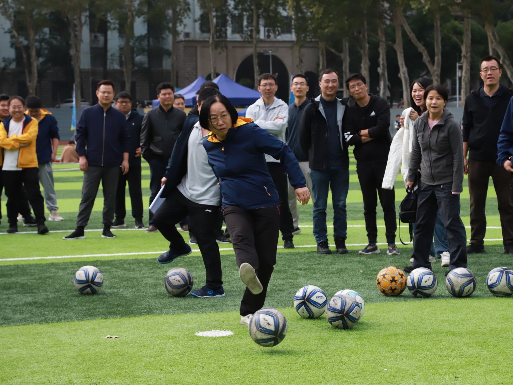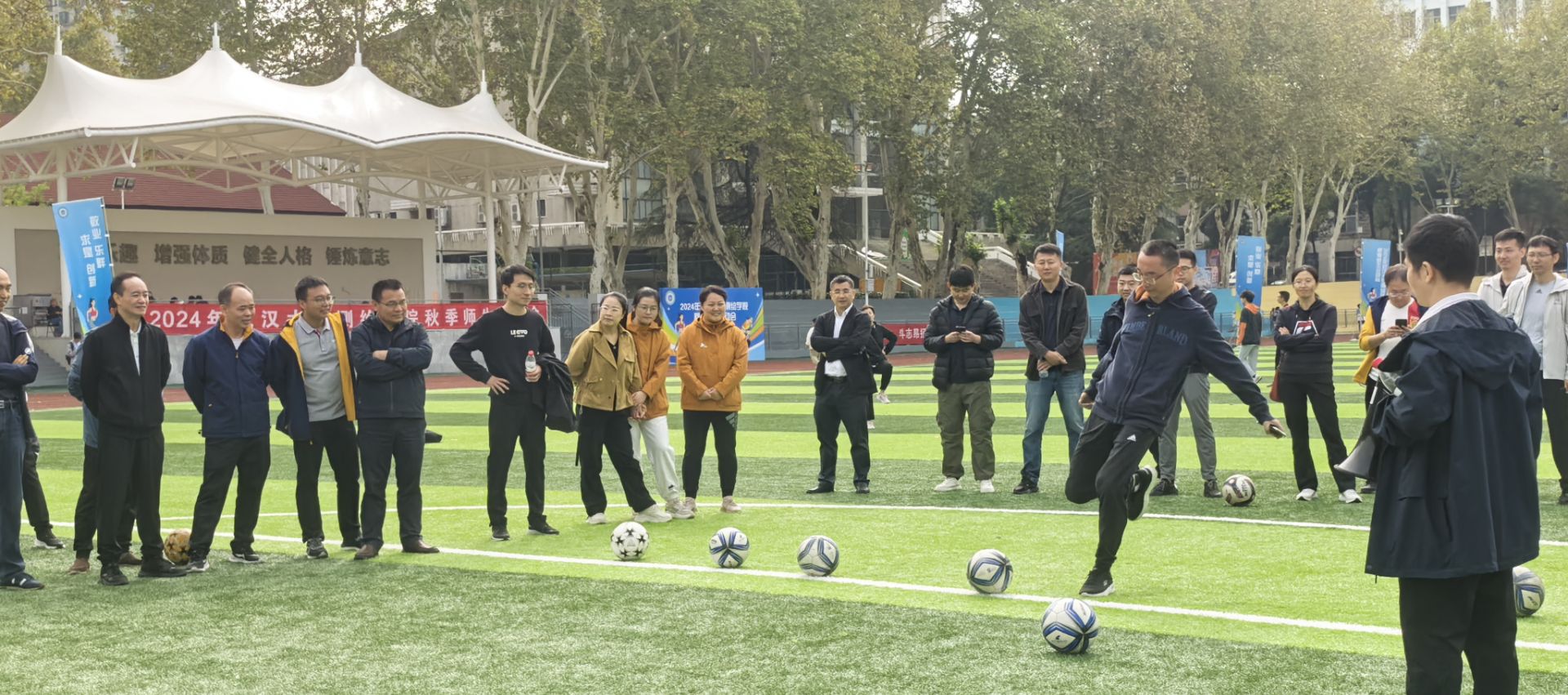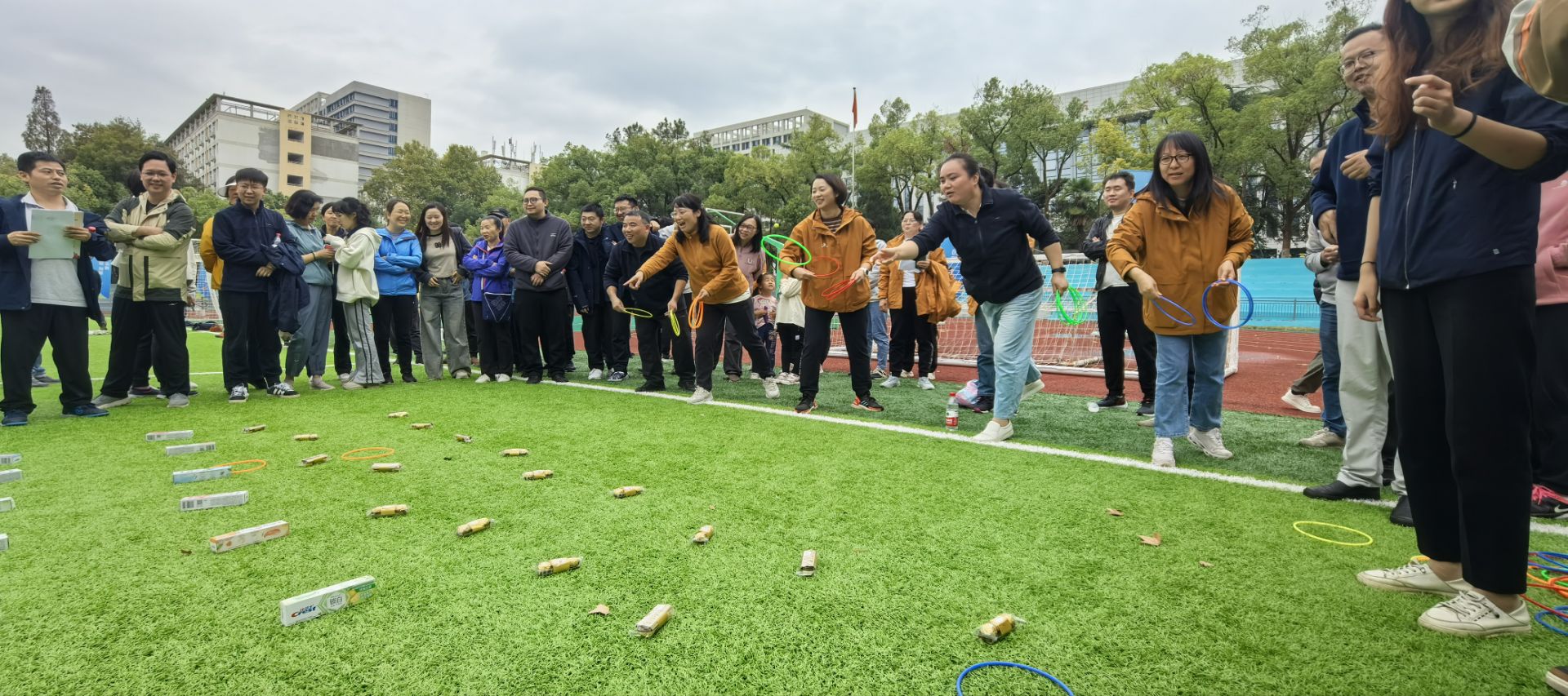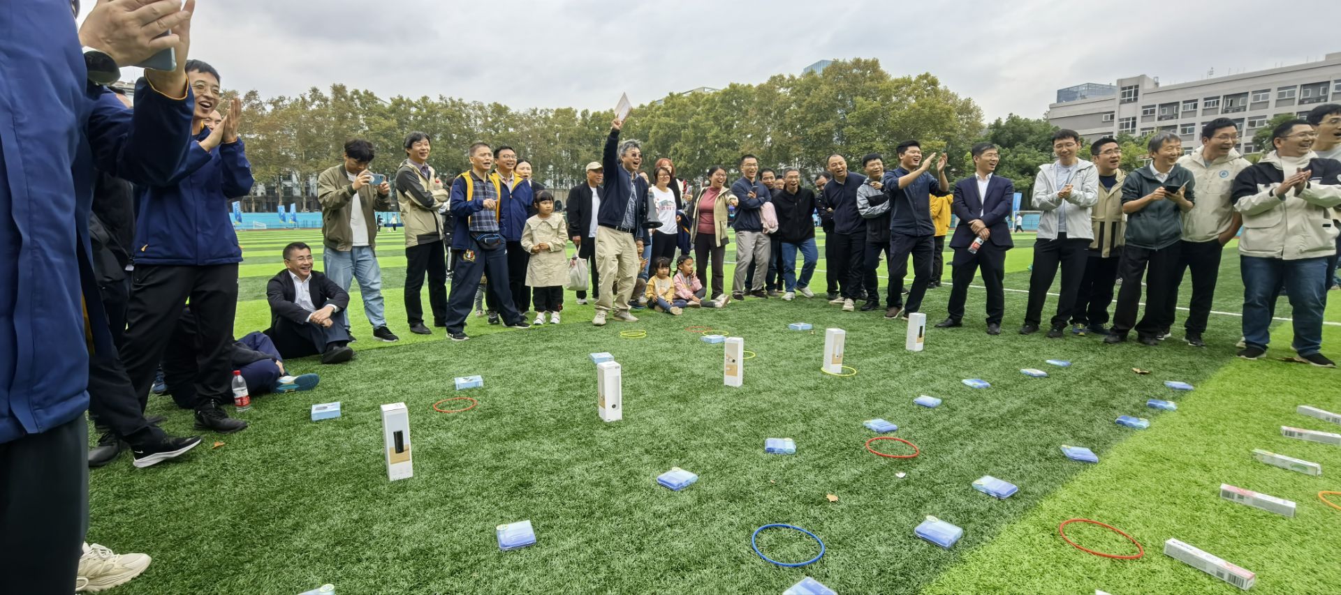 开幕式结束后, 2024级本科生举行了广播体操比赛。接下来,师生运动会的各项比赛依次上演,网球、篮球、足球齐上阵,大家展现十八般武艺,花样接力笑点频出;往左、往右,颠鼓击球用团结的力量敲出清脆的回响;往上拋、往下拋,趣味套圈扣人心弦……大家团结一致,争夺桂冠。老师们健步如飞,展现不同以往的一面;同学们踊跃配合,探索竞赛新局面。笑声、加油声充斥整个操场,驱散了清晨的寒意。