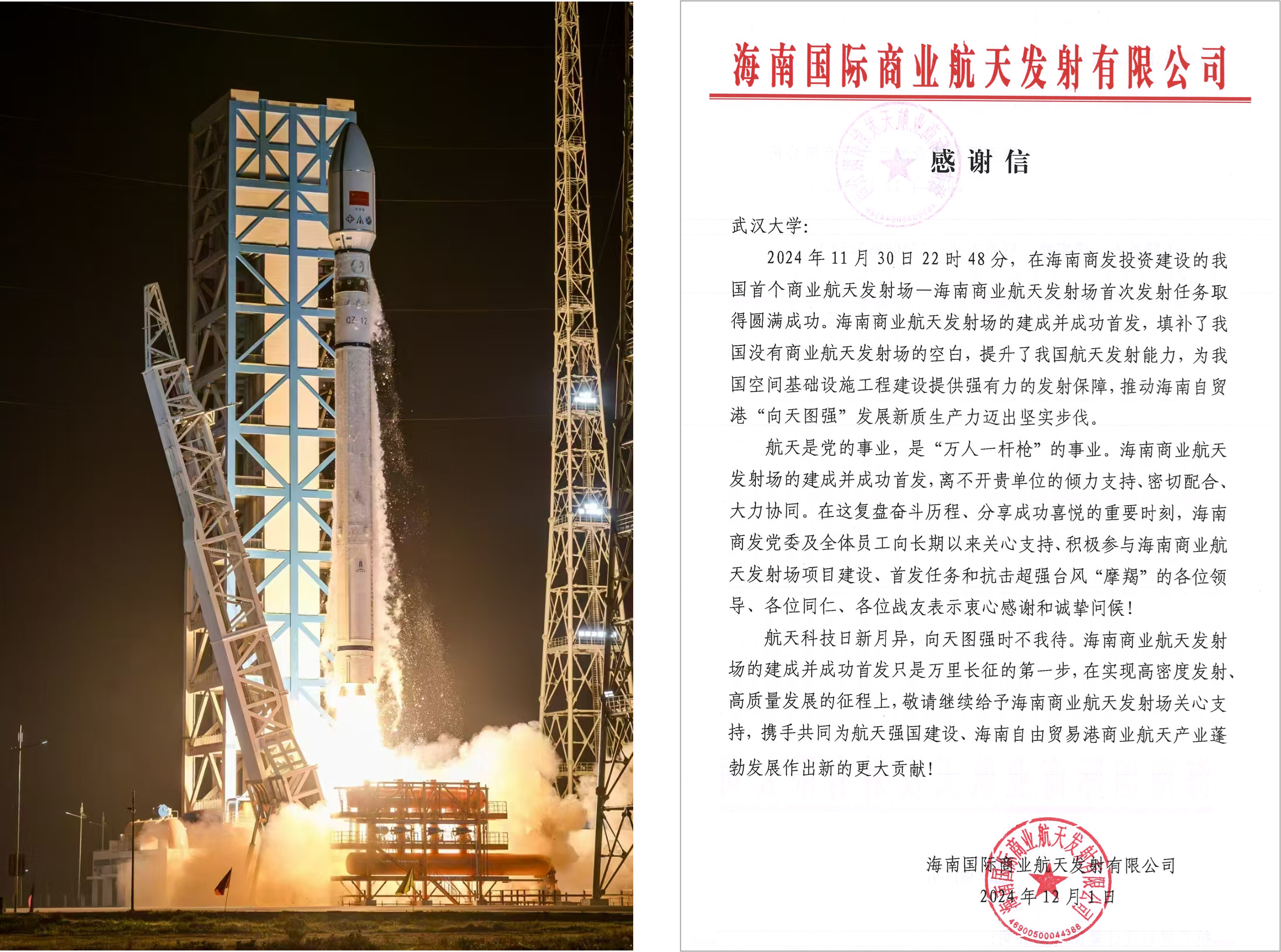 海南国际商业航天发射有限公司发来感谢信,感谢草榴社区 团队给予的倾力支持、大力协同和密切配合。海南商业航天发射场的建成并成功首发,填补了我国在该领域的空白,提升了我国航天发射能力,为我国基础设施工程建设提供了强有力的发射保障,助力海南“向天图强”发展新质生产力迈出坚实步伐。