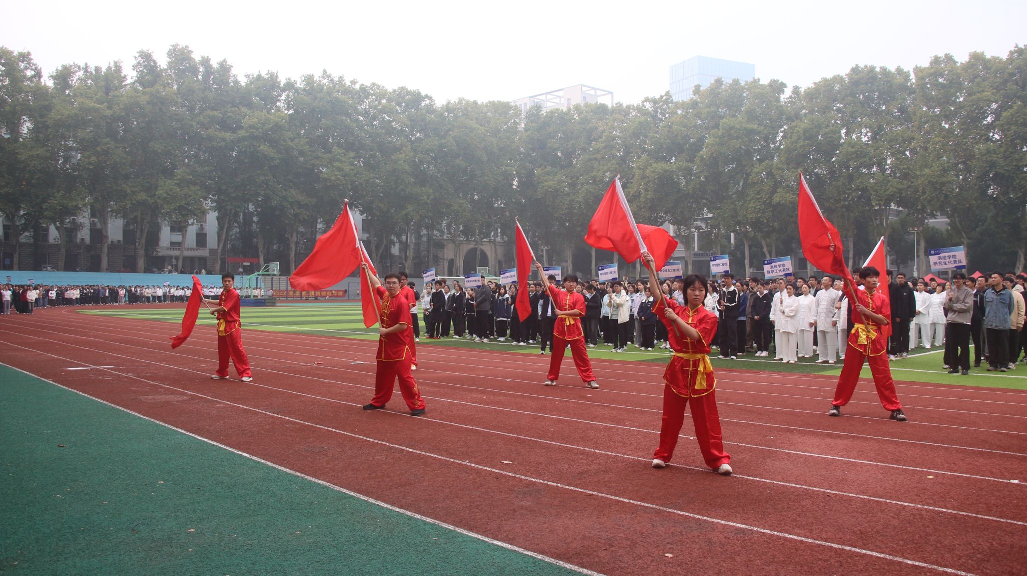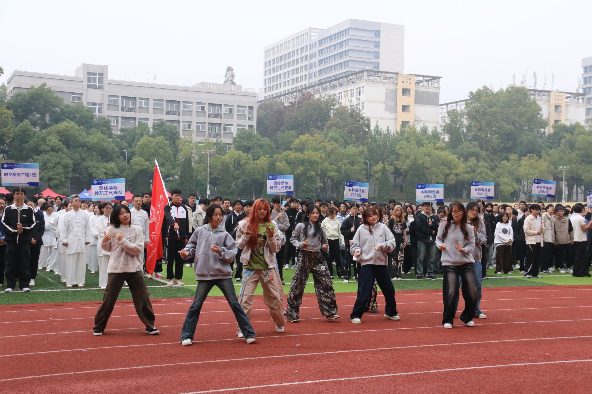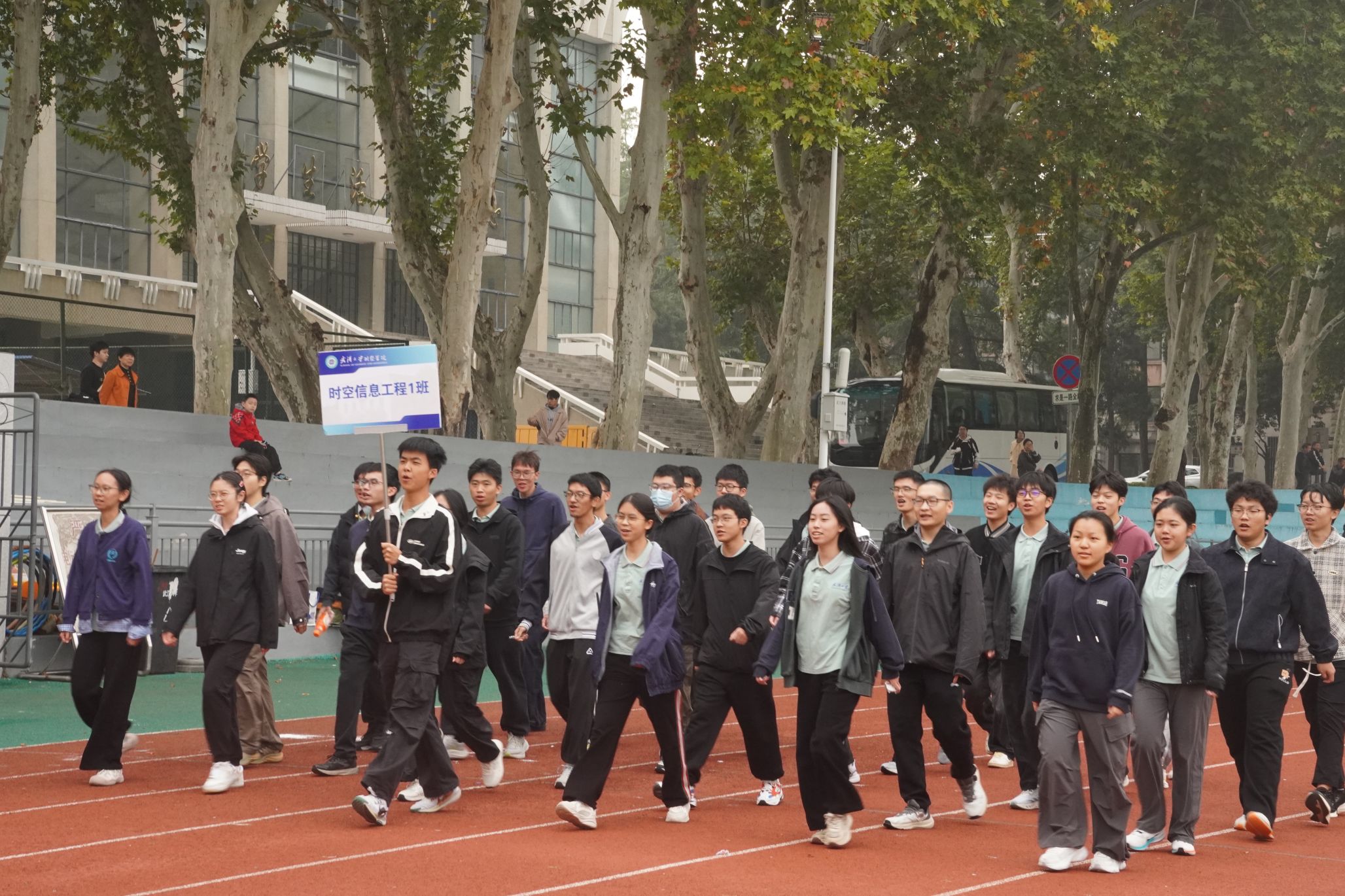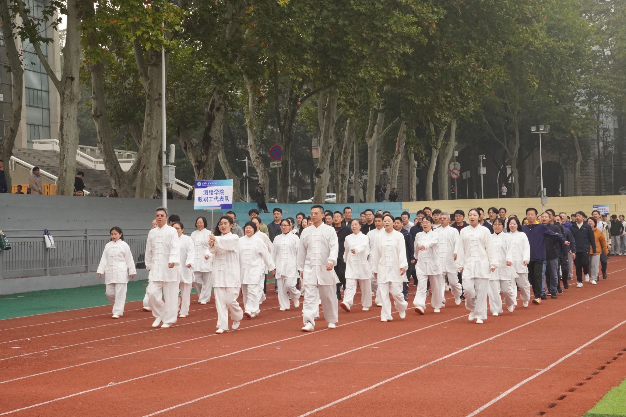 伴随着激昂奋进的运动员进行曲,教职工、研究生、本科生代表方阵依次入场,他们步伐矫健,口号响亮,彰显着新时代测绘青年昂扬向上的精神风貌。