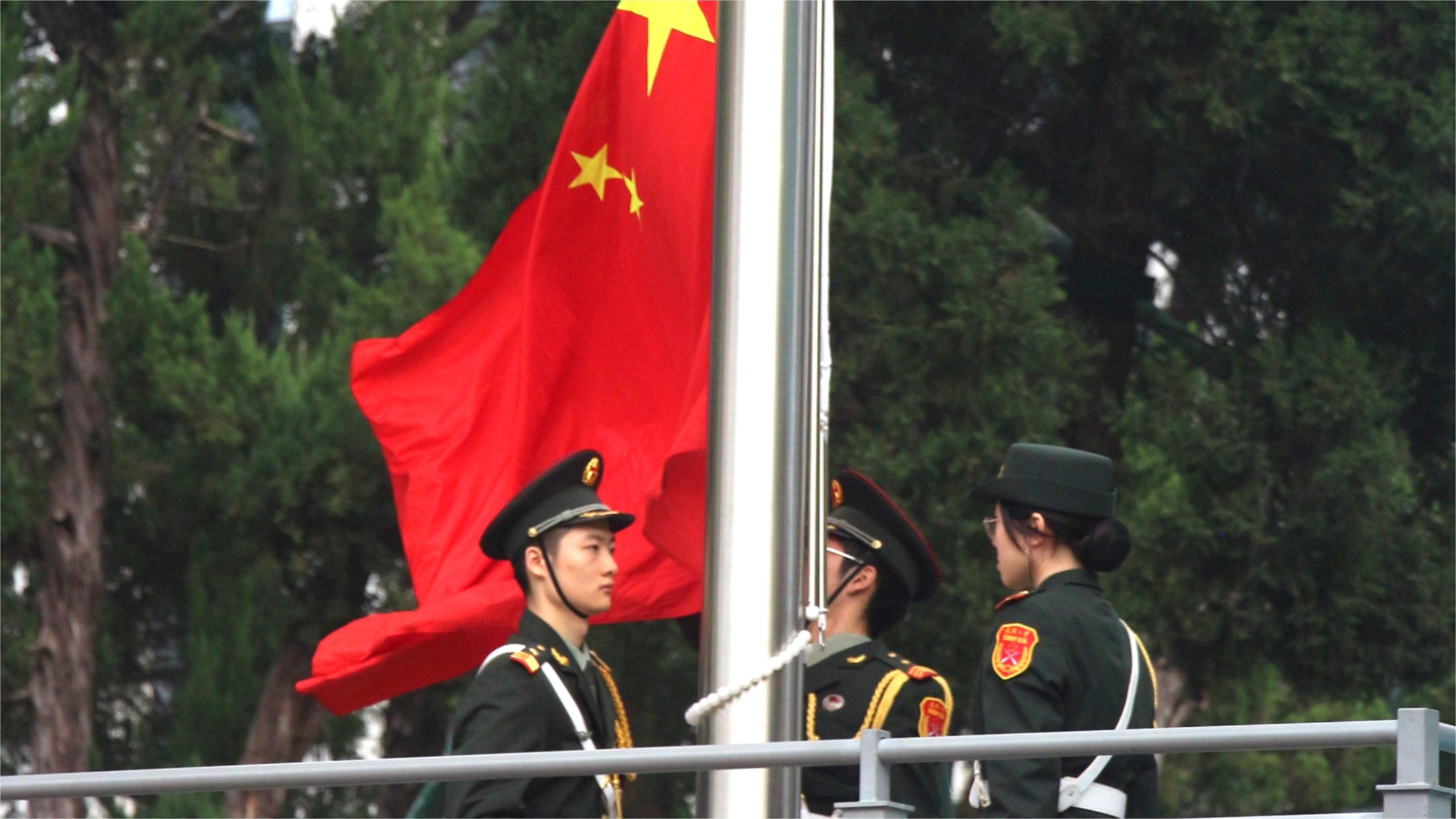 全体肃立,奏唱国歌,五星红旗冉冉升起,庄严嘹亮的歌声响彻赛场。