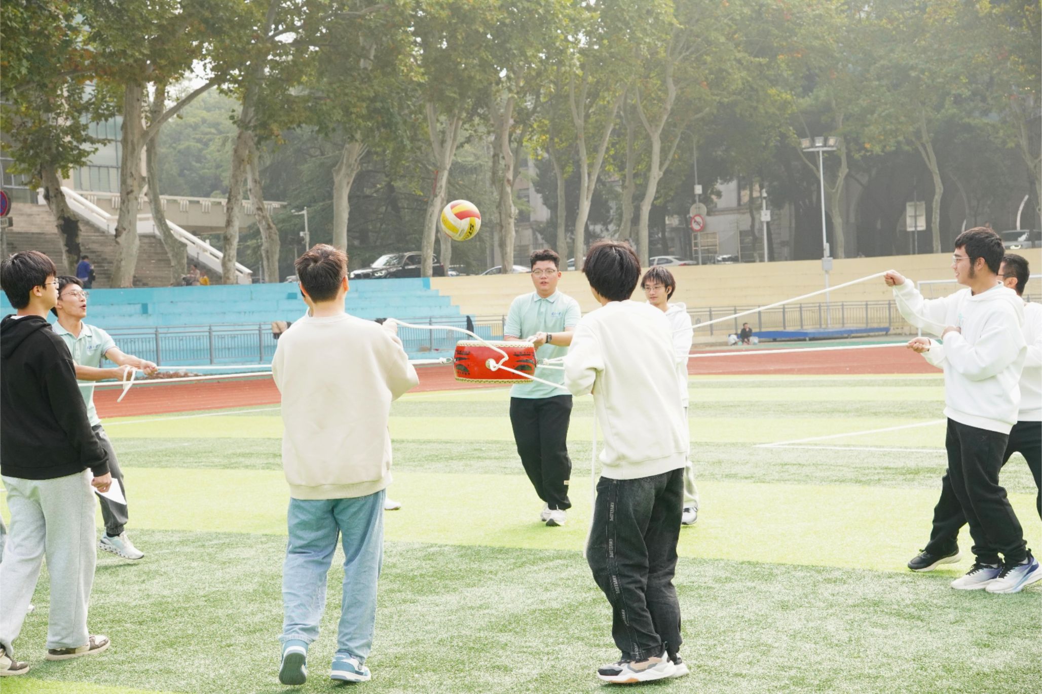 在趣味运动比赛项目中,从网球、篮球、足球的正式较量,到花样接力带来的妙趣横生;从需要齐心协力的“同心击鼓”,到考验手感与运气的“趣味套圈”,每一项比赛都是一幅活力的剪影。师生同心,只为共同的荣誉而战。赛场上,老师们步伐轻盈,展现出讲台之外的别样风采;同学们则用完美的配合,书写着青春的交响诗。此起彼伏的欢笑与助威声,如同一曲温暖的乐章,让整个运动场沉浸在欢庆的节日气氛中,秋日的凉意也在这份热情中悄然消融。
