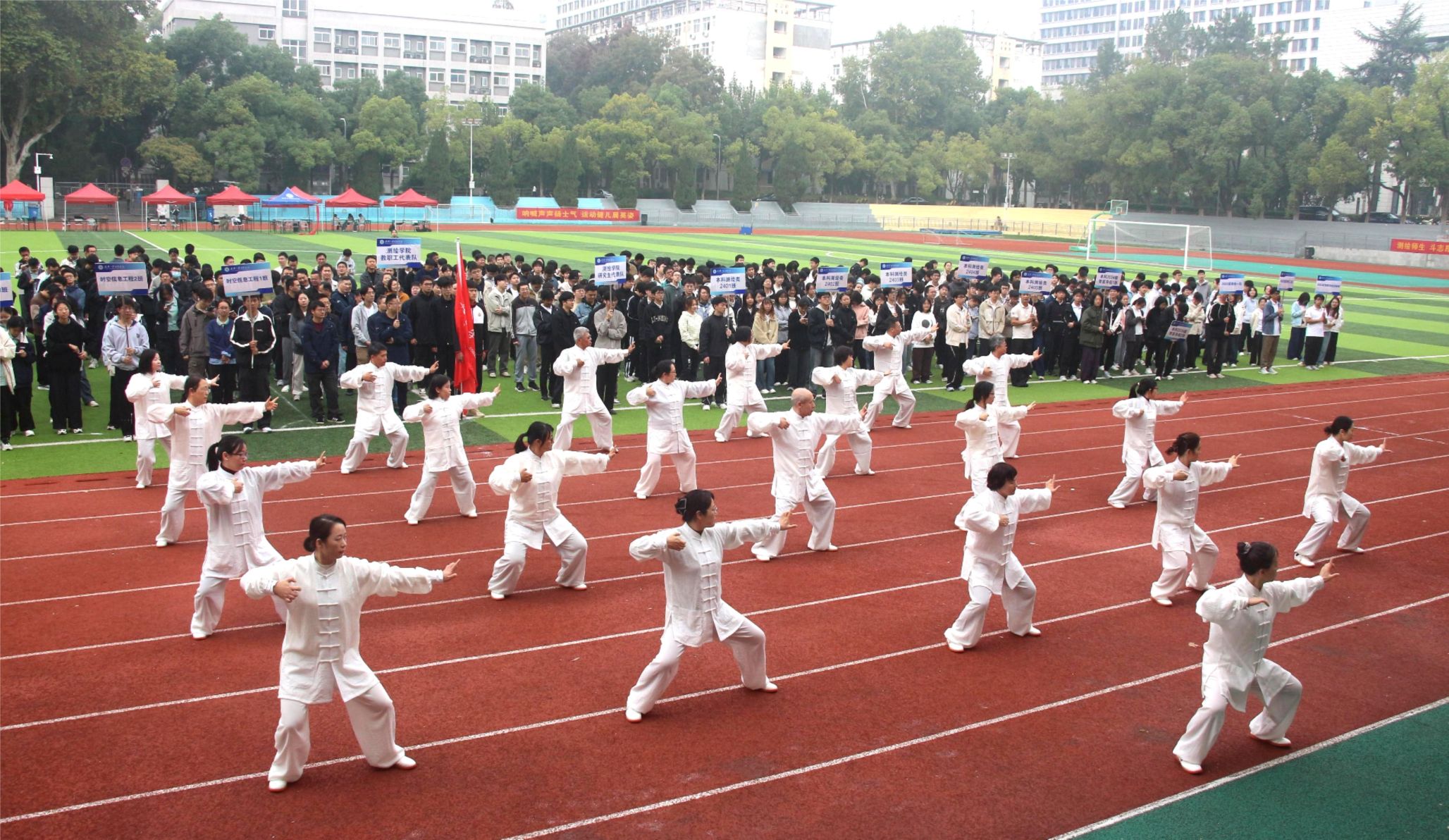 开幕式结束后,教职工展示了八段锦健身气功,2024、2025级本科生进行了广播体操展演。