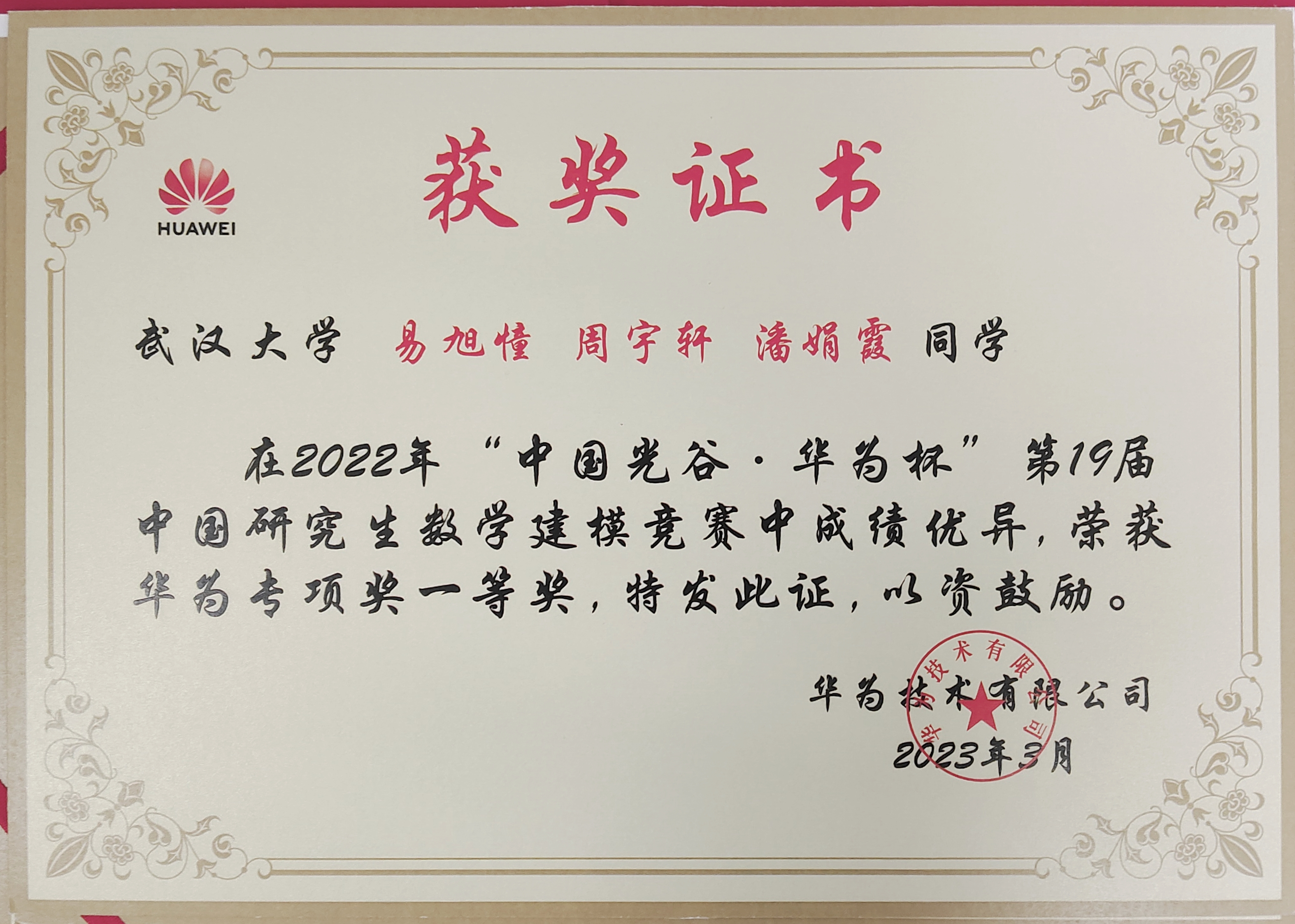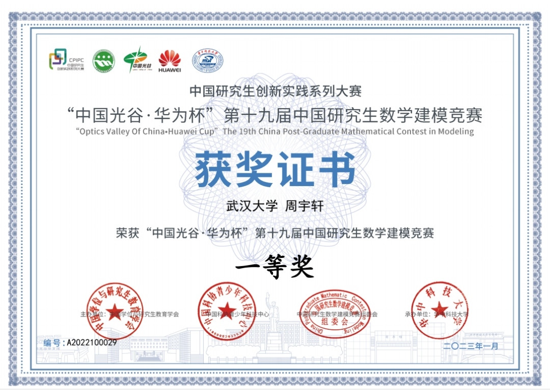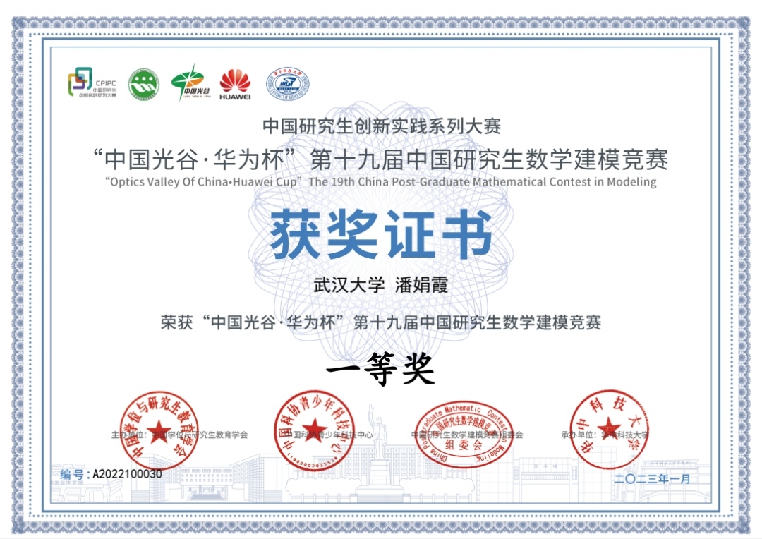 瞄准原始创新,聚焦基础研究。3月19日,“中国光谷·华为杯”第十九届中国研究生数学建模竞赛颁奖典礼在华中科技大学光谷体育馆举行。学院研究生易旭憧、周宇轩、潘娟霞从来自全国465个研究生培养单位超6万名参赛研究生中脱颖而出,获得“数模之星”提名奖、全国一等奖、华为专项一等奖。