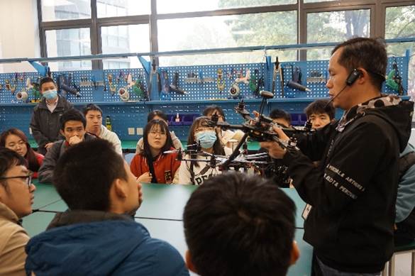 华测导航专注于高精度导航定位技术的研发、制造和产业化推广。组装教室里,同学们围坐一圈,在讲解人员的介绍中了解四轴和六轴无人机的组成结构,并尝试进行起飞操作。