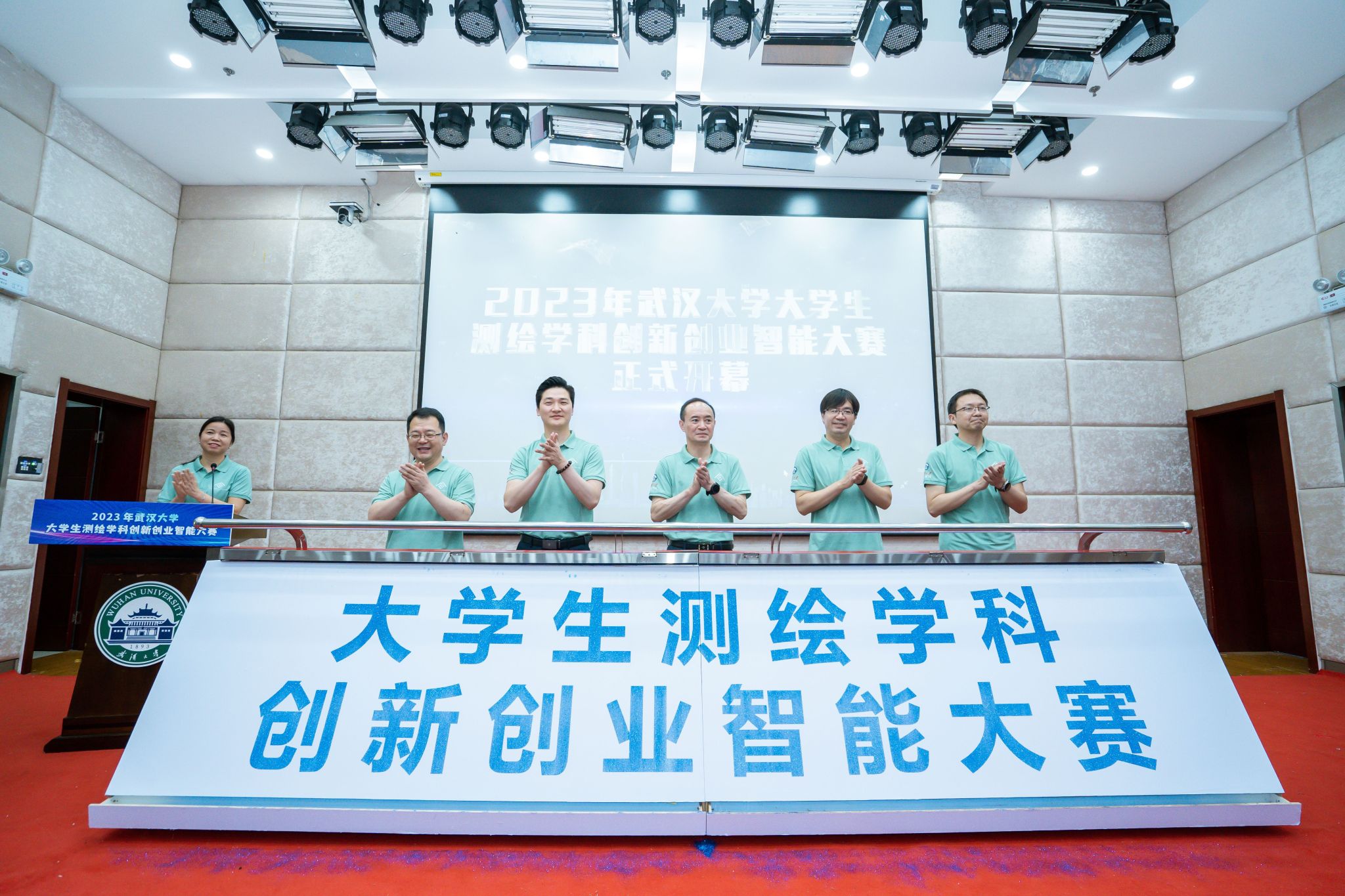 随后,裁判员代表章迪老师和参赛选手代表向维同学分别宣誓。最后,本科生院余天华副处长、草榴社区 晏金柱书记、南方测绘罗君总经理、遥感学院龚龑副院长、资环学院任福副院长一起上台为大赛揭幕。
