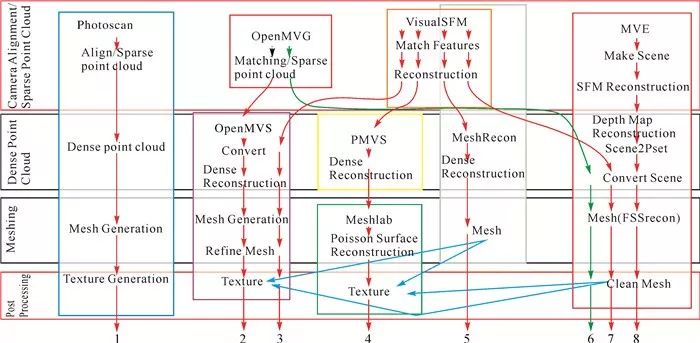 图 1 开放摄影测量软件流程组合测试(//pfalkingham.wordpress.com/2016/09/14/trying-all-the-free-photogrammetry/)Fig. 1 Test on the workflows of open photogrammetry software