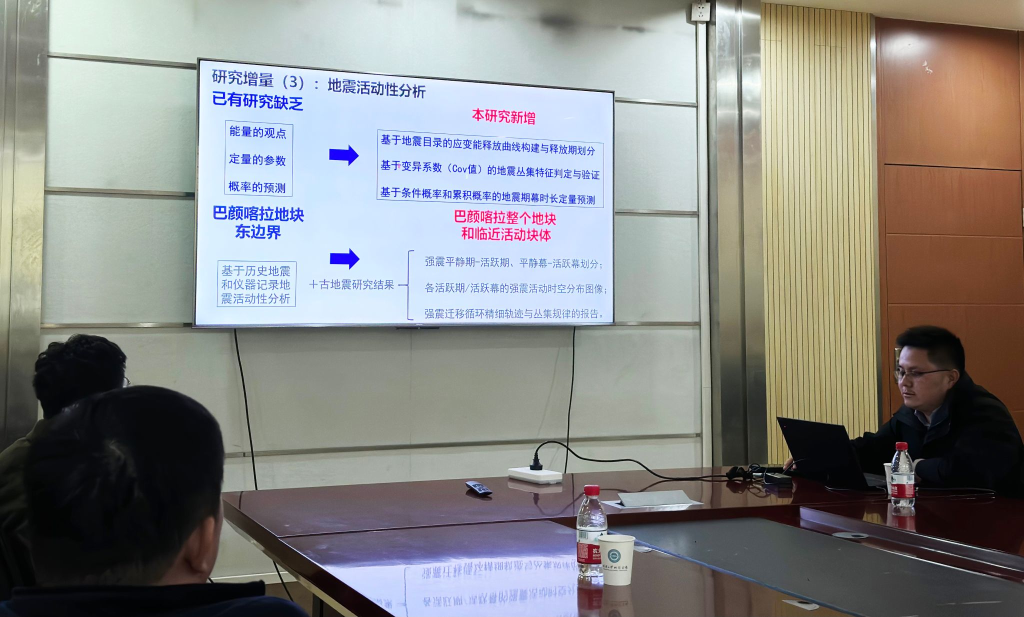 在报告二中,邹俊杰副研究员首先基于古地震调查、历史地震资料和地震仪器记录的多源数据,构建巴颜喀拉地块内部和边界带强震活动的时空分布图像,划分强震的期幕特性、丛集特征,分析强震迁移规律。进一步基于建立的完备地震目录计算块体内部和各边界平均年应变释放速率,研判地震主体活动区。最后基于建立的完备地震目录,计算巴颜喀拉地块内部及周缘的强震条件概率和累积概率,判定整个活动地块的强震紧迫性。