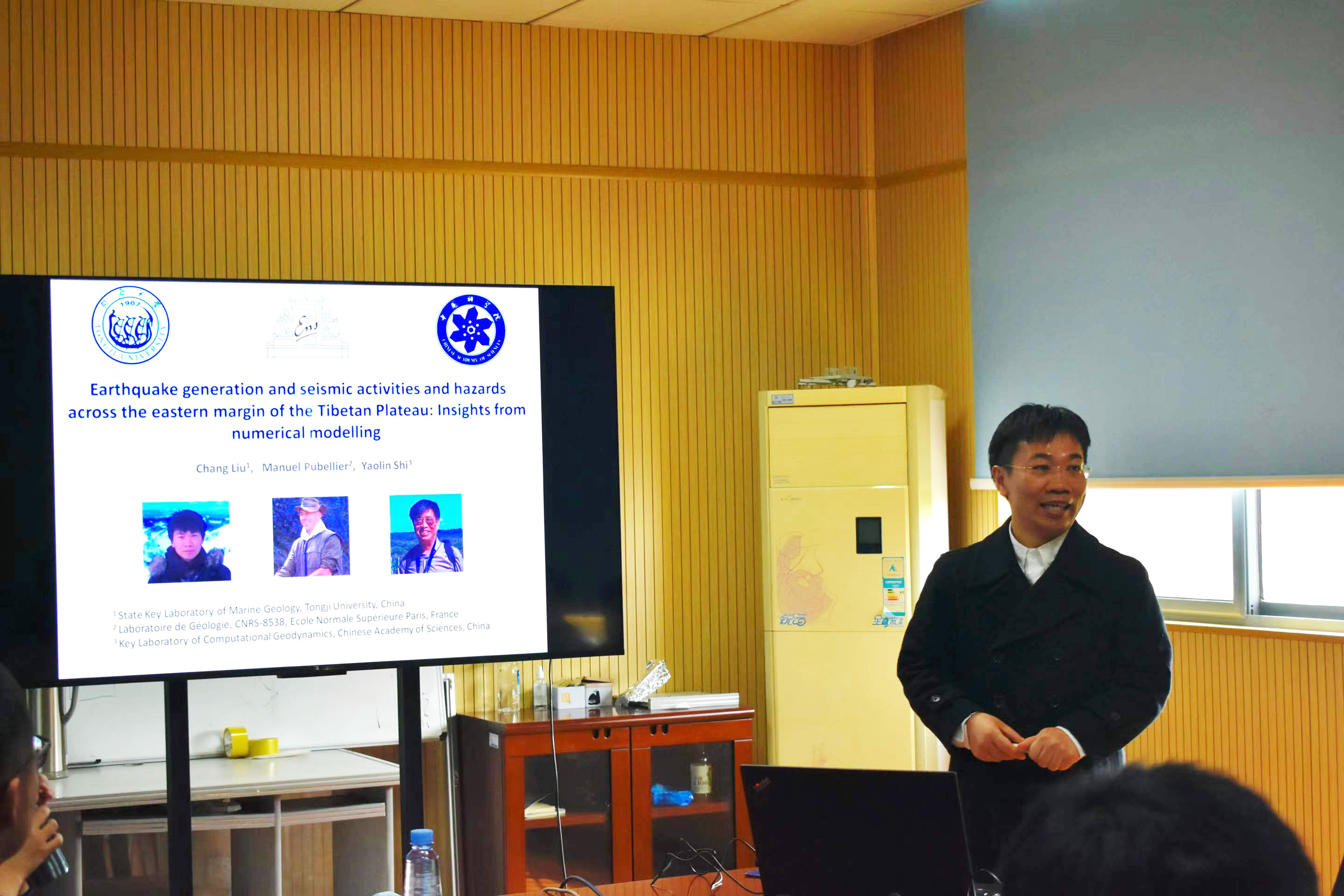 柳畅副教授研究的主要内容是青藏高原东部的龙门山断裂带上大地震的发生模式与机理。本次讲座,柳畅副教授详细讲述了他是如何通过建立青藏高原东部地区的三维粘弹性岩石圈有限元模型,结合真实地球物理探测得到的地质物性参数,运用数值模拟技术来分析该地区岩石圈应力状态与演化过程的。针对2008年汶川地震与2013年芦山地震的发生与破裂传递,柳畅副教授详细分析了大地震的震间应力积累、同震应力变化和震后应力松弛,认真探究了发震地区未来的危险性,并通过分析应力的时空演化与地震活动之间的关联,进一步估计了该地区Mw7.9级大地震的复发周期。